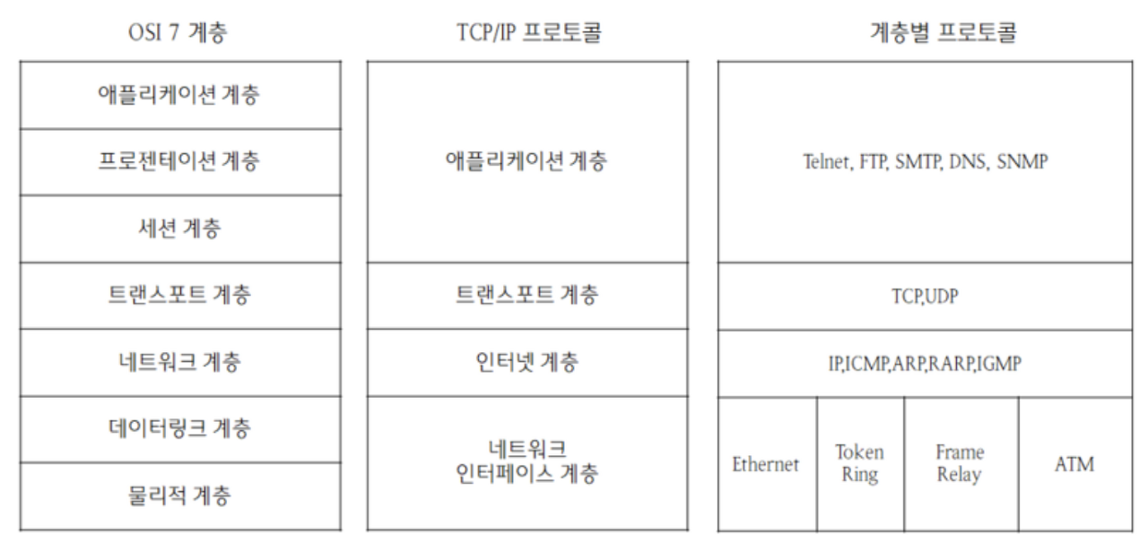 | 응용 계층, 표현 계층, 세션 계층 | 응용 계층 | Application간의 데이터 송신, 수신 제공( Telnet, FTP, SMTP, DNS, HTTP ) |