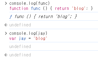 var, function은 위에서 말한대로 호이스팅이되기에 아래와 같이 선언하게 된다면 에러가 아닌 undefined가 출력된다.