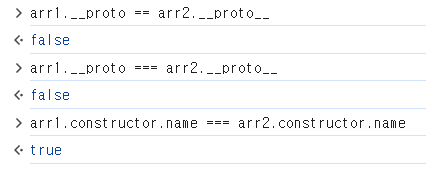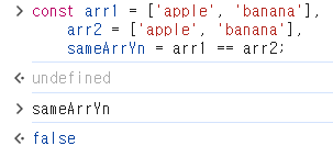 값이 같다면 true가 떠야한다고 생각할 수 있지만, 두 배열의 실제 값이 저장될 메모리 주소는 다르기에 값이 다르다고 할 수 있다. 이는 위에 나왔던 const가 수정이 가능했던 것 과 같다.
