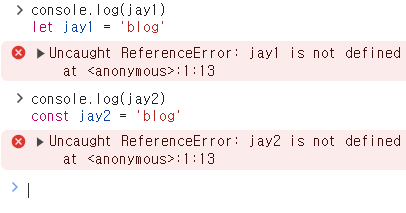 위와 같이 에러가 나타나는 것을 알 수 있다. 이것은 javascript의 특징 중 하나인 scope 관련 내용으로 추후 자세하게 내용을 다루도록 하겠습니다.